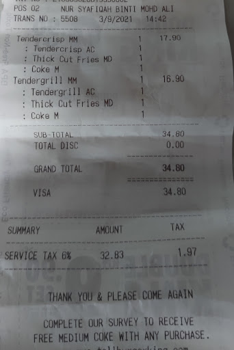 Read moreIf takda beef burger, I think possible to turn off the TV that shows the beef burger or simply put sticker not available? Katanya fast food, tapi I waited 20mins+ for my food. Time stamp as per terminal receipt was 4.22pm. Mind you I said this TERMINAL RECEIPT ya. Why you ask, because should be ada invoice receipt for me to refer my order number but instead the staff said random number ??? Staff 5-6 there buat apa? I saw customers coming while I wait for my food, they didn't even toleh belakang, but I did saw some if them nampak customer datang but didn't attend them. Why ya? No comment on the food, pretty...