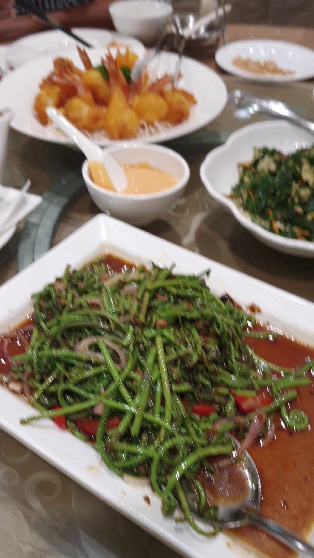 Our menu choices included stir-fried midin (a famous Sarawakian vegetable), Teow Chew pan-fried oysters, stir-fried mani leaf, the signature Hainanese special prawn, and bamboo shell with cheese. Surprisingly, my favorite dish turned out to be the stir-fried mani leaf, while the seafood, although OK, had smaller prawn sizes and didn't quite meet our expectations. The waiting time for our dishes was around 20 minutes, even though there were only two tables of customers, including us.