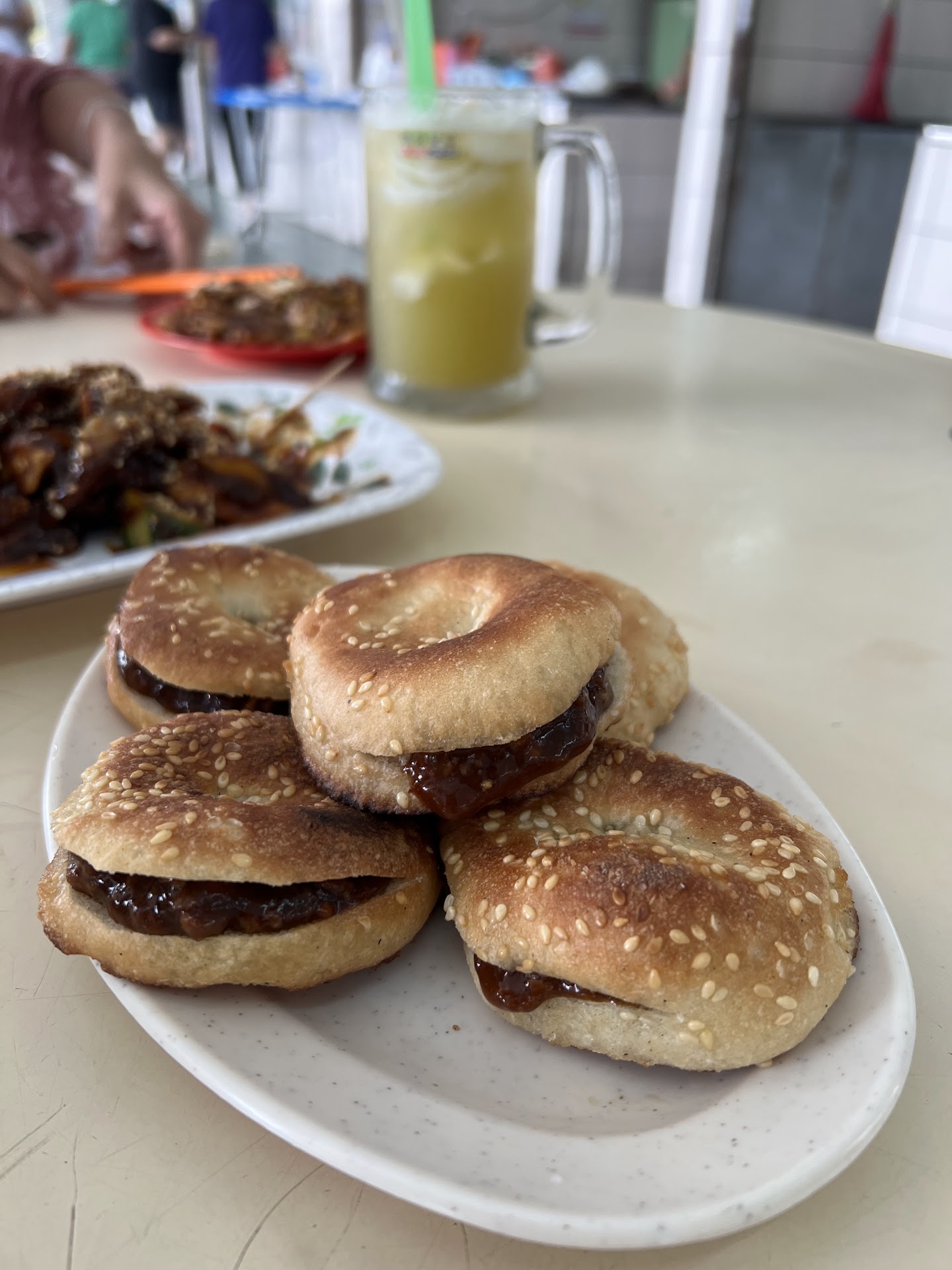 Stall 11: no English name, Gong pia #2 sold the bigger fluffier donut like version with no filling but sweet and savoury kind of glaze. Really yummy! 1.20 RM for 1. They also appear to sell curry puffs and deep fried bao but didn't seem to have these.