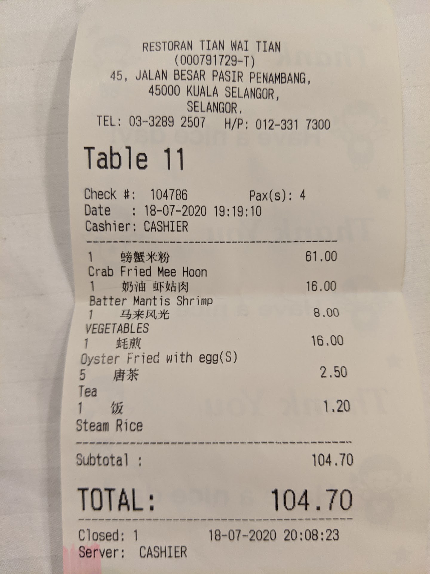 Our receipt for 3 pax is attached. Came out to 104.xx which is pretty decent considering we had 3 crabs in the bihun. The crabs were quite fresh and tasty.