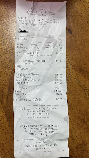 Happened 3 times. 3 charming times. The order has been received very much late. Took almost 2 hours waiting for my pizza. The last time, after 1 hour and 30 minutes, decided to go and pickup by myself. Ended up having to wait for another good 15-20 minutes. Very very very poor service by the crew. Very disappointed with this outlet. So far, yup Domino's usually will be my first choice when it comes to pizza. When I'm at my own home at Nilai, Negeri Sembilan, I got NO such issue like this ever. But whenever I would like to order for my mom, my my. What a disappointing thing to happened. The crew shouldn't just prioritise the pick-up order ONLY! Supposedly organised the order received for the delivery and pick-up, systematically! FOLLOW...