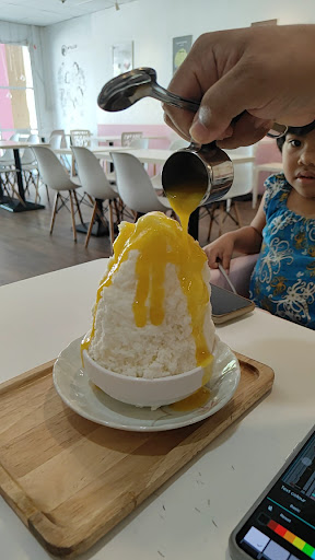 Firstly, when I get here, I was so glad we had no waiting queue here - plenty of tables on a Saturday night. Secondly, we need order at the counter. Unfortunately there's no menu we can hold. Their menus were stuck on the counter. As I was waiting for the couple in front to decide her orders, I wanted to start planning my order since it's my first time here I was unfamiliar with what they have. We wait for our numbers to be called. Our orders are made promptly despite 2 other numbers ahead of us. Thirdly, we start eating with the kenko kakigori - it comes with 2 fruit choices, my only complain is everything falls out to the table as I spoon them. Then we ate the pancake - caramel chocolate banana waffle. I like the fluffy waffle. Last bit least we devoured mount Fuji kakigori. I ordered a large one since I wanted to share but I quickly regret my choice after seeing how high it is. There are fruits in it but the fruits are so frozen and the mango was not that ripe. As I was writing the review and the expected happened, the mount Fuji kakigori collapsed as shown on the pic. Their ice was not a nice compared to after meal. At least they don't enforce an hour restriction. Note if u want to choose table, do not sit at the one with the nice dangling unicorns as I knock my head when I got up and I wasn't even seating at the end chair by the wall. Finally, the songs...