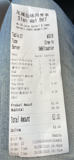 The price was unreasonable for what we received — RM62 for two small bowls of Bak Kut Teh (mostly fat), one you char kway (fried dough stick), and a fried egg. As a local customer who enjoys and supports Malaysian cuisine, I found this to be a poor value for money.