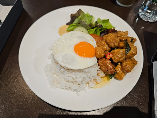 The butter chicken rice with sunny egg was absolutely delicious – flavorful, satisfying, and perfectly cooked. To top it off, I tried the café latte, which was rich, smooth, and expertly brewed. Mr. Karuna also recommended the raspberry mousse cake, and it did not disappoint! The dessert was a delightful blend of sweetness and tanginess, with a creamy texture that melted in my mouth.