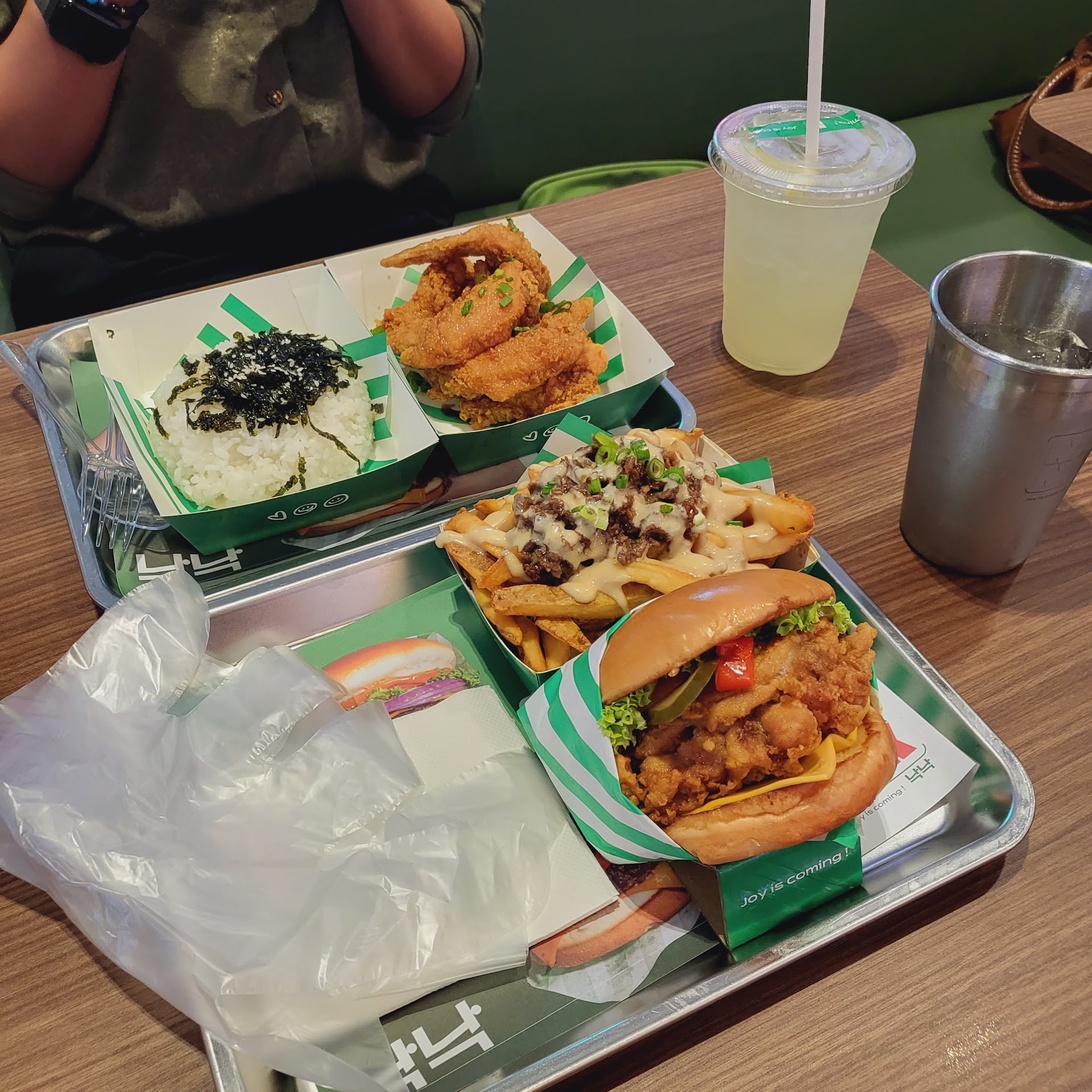 Food: Damn... that's so gooddddddd!! From the fries, seaweed rice, chicken, and burger!. Believe me, you won't find huge burgers at affordable prices. As i remember, the best burger was Carl's Jr. They had big bigger with bacon and mushroom on it. Unfortunately, it closed. It's so hard meh to find a good burger with big size like american style. But here, you won't expect what you expect once you receive it. I ordered a spicy chicken burger, not the one with kimchi soy, and beef fries on top, garlic honey chicken with seaweed rice. Yummy weh! Trust me.... i hope they will open the nearest KL. You need to travel through KL to putrajaya. Urgghh. The flavor kicked!