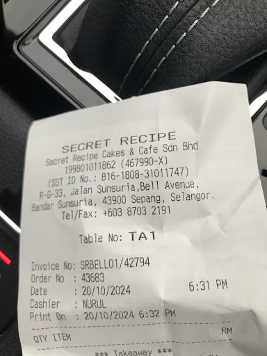 Read moreA complete rip off for those dining in The pastery has 2 prices one for take away and one for dine in (which is higher). So I made my choice to dine in but to my surprise, I was charged the dine in price (the more expensive one shown on the price tag) plus the 10% service charge (which is usually paid as a charge to those dining in at all restaurants). It felt like tese guys are ripping off their customers by charging them twice on dine in service. When I complained, the stuff did not add more than: these are the rules!! We can do nothing!! I used to be a loyal customer of secret recipe. But recently I saw change in attitude and deteriorating customer service. Not...