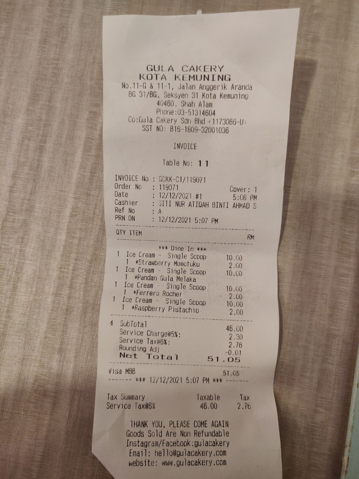 I came here with my friends on Sunday, 12 December 2021 at 4.45pm. We were asked to wait outside for about 10 minutes for a table. At 5pm, we entered and sat down. We then proceeded to go to order at the counter after being told that they offered waffles and ice cream. However, when we went to the counter, we were then only informed that they had ran out of waffle batter. We weren't even informed that they were no longer serving waffles at the front door, where we could have changed places to dine at if we knew. Finally, we ordered 4 scoops of ice cream at 5:06pm.