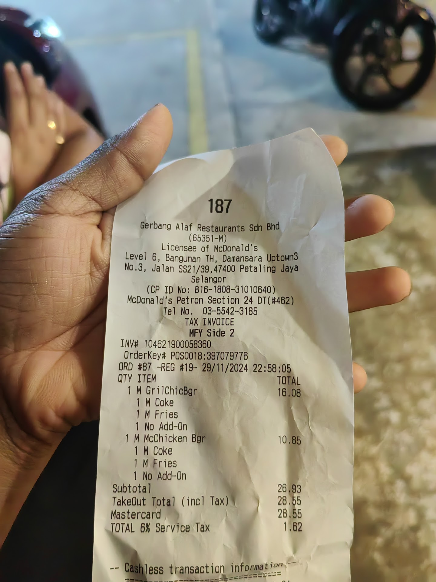 I want to complain regarding service. After order at drive thru, the staff should repeat and my order should appeared at the screen, right? But it didn't. I want to order Crispy Chicken Scrambled Egg Sandwich but got Scrambled Egg Sandwich only instead. Ordered Latte with 1 pump sugar. Luckily I sip on the dot, no sugar so need to ask em to add sugar. As I've been craving Crispy Chicken Sandwich, am willing to order again. So yup. Twice. Second time, me myself need to reconfirm my own food at the payment counter. The staff simply replied "yang tu lain kak". I don't have energy to argue since it's morning and I don't want to waste my time and energy. At the first place, you should reconfirm my order and my order should appeared on the screen with the amount that I should pay. Hereby, I attached my receipt of purchase as I look forward on the management to look after this matter.