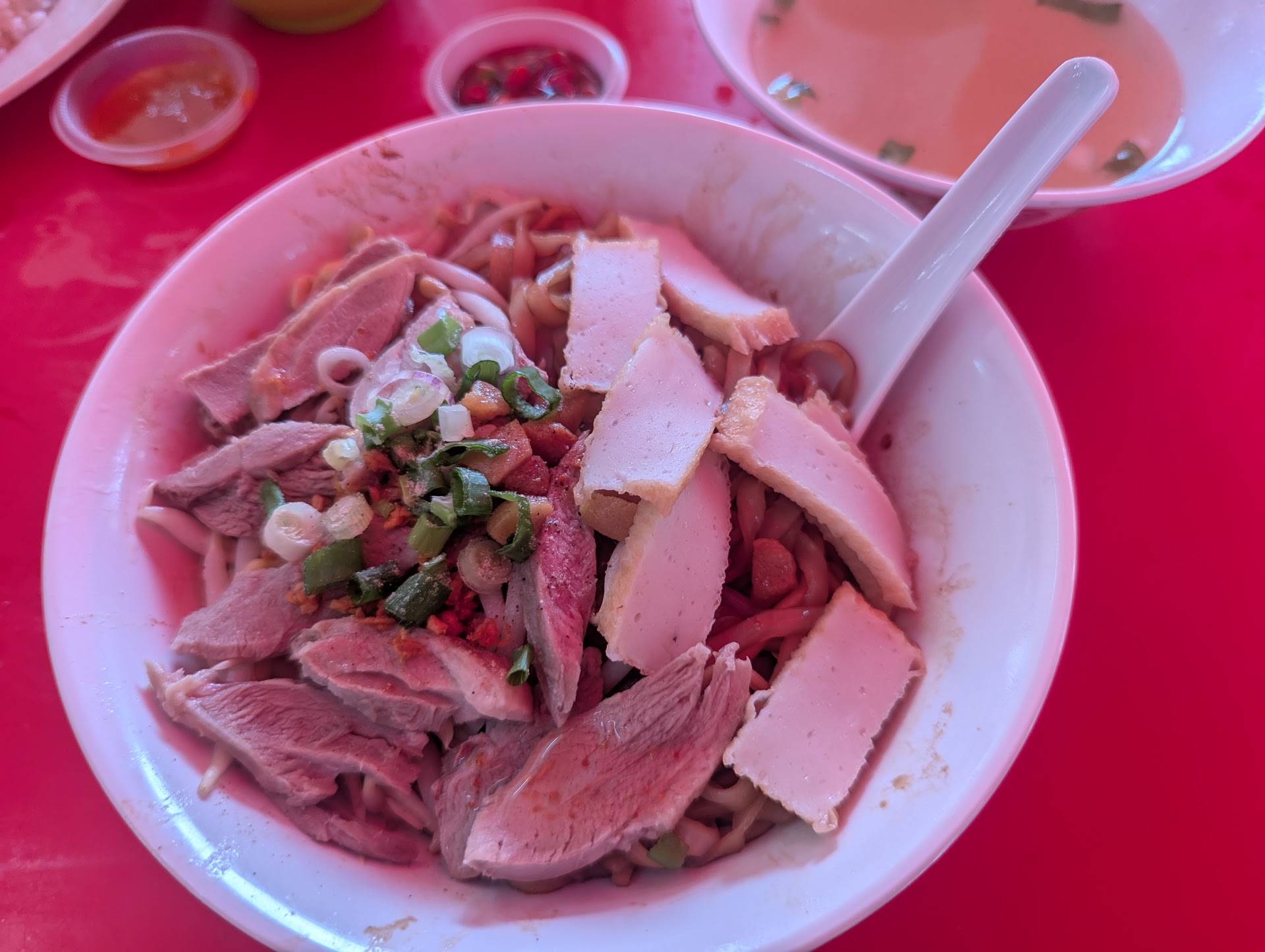 We ordered chicken rice & duck kway teow thng. Chicken rice was average at best. The meat was tender & juicy. The duck noodles were really good. Packed with flavor. The accompanying soup was warm & peppery. The stall is run by an elderly couple. Worth a try.