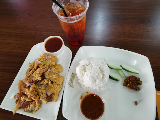 The Good Come here with family of 12 adult & 2 toddler. Table provided as ady booked earlier. Fast service. Waiting time after order less than 5min. Location easy to find with huge red signboard. Great food with reasonable price. Nasi kukus sotong besar RM15.00/set. Fruit juice RM3.00/glass. Signature dish is 'nasi kukus sotong besar'; deep fried battered squid served with steamed rice. Taste good & delicious. Takeaway leftover food very neat. Tupperware & tealive-style cup.