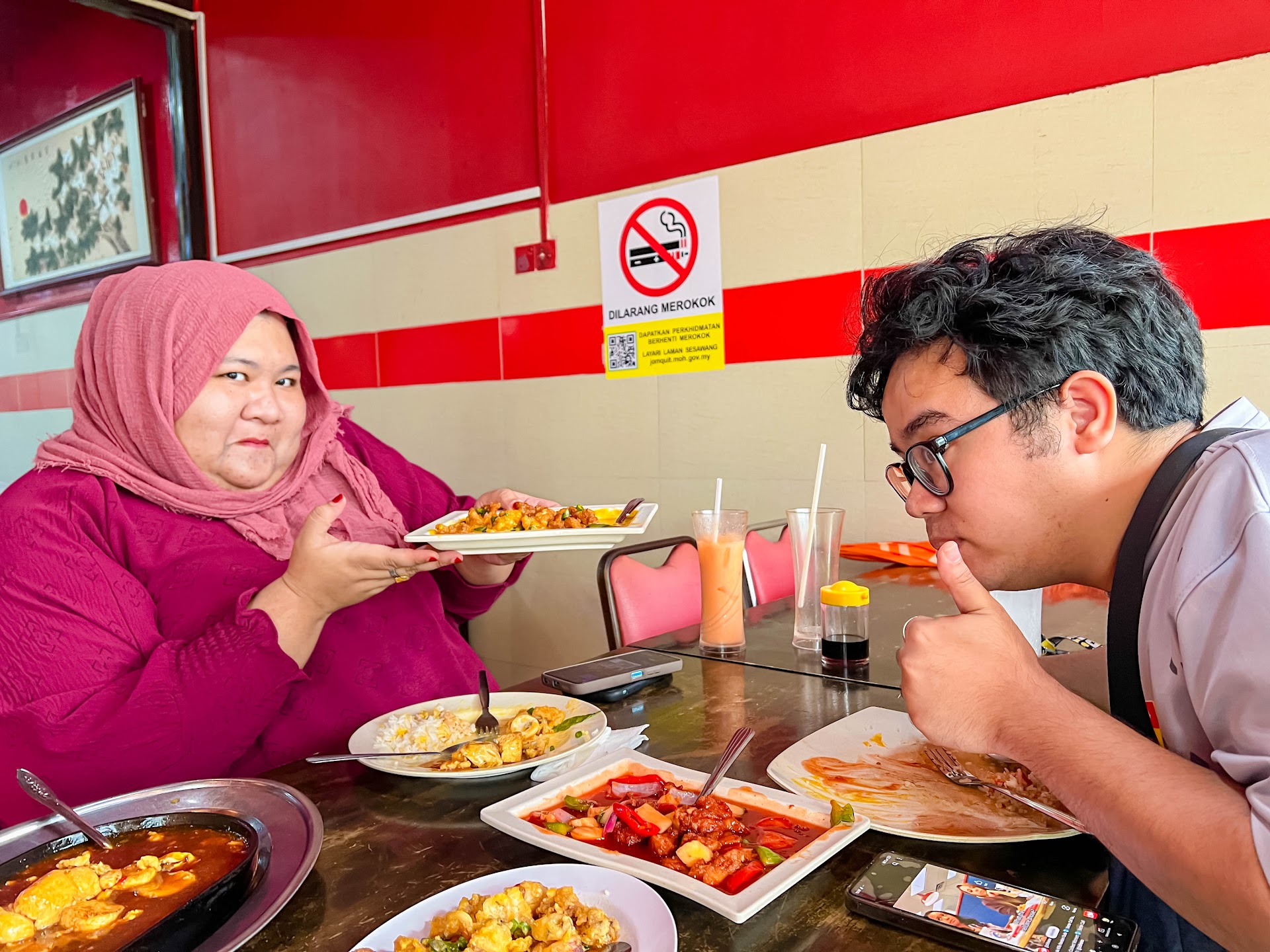 The taste if the chicken dishes, kam heong and ginger were just alright. The sad part was that there were more bones than flesh on the chicken. They cut it into small pieces. You would expect more flesh la kan, macam ayam goreng kunyit. But, nope. You can't really enjoy them because you were busy removing bones from your mouth. The salted egg sotong was better than the chicken. Egg fooyong were okay. Can't go wrong with eggs kan. The vege, kailan and mushroom was good. The kailan was fresh, the highlight of all dishes. The kids had different nasi goreng each, and each one was little salty. So, all in all, food is average because but because of the chicken, macam jatuh anak tangga la, thank god for the vege. Service, average. Make sure you...