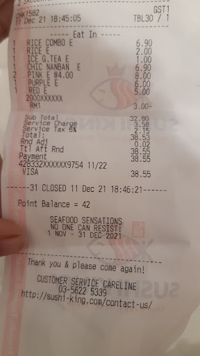 Read morePlease don’t come here. Very bad experience. The moment we arrived, nobody came and gave us a seat. There were not a lot of customers. Therefore, we seat ourselves. Then we didn’t noticed that our table does not have the button to call for waiter. We started to notice after we have already ordered the food so quite a hastle to change tables since we have kids. After that, our drinks never arrived until we done eating. Called and signaled a FEMALE waiter with a black spectacles to request them for our water that we have ordered. Completely ignored us like we aren’t there. Then my husband went to another MALE waiter with chinese looking face. Walk himself to the waiter requesting it since we thought they were busy. He noted. Waited. But still no water sent. Again, the same female waiter looked at me, and I SIGNALED her AGAIN, to come and help us but she just look and go away. My daughter was misrable eating feeling choked without ANY water sent. Please whoever is the owner of this SUSHI KING take some actions to both of them. I came on 26/5/2024 (Sunday) evening. This is not the first time. The male waiter was rude to my sister previously we came to sushi king. Slammed the plate on the table. Thought gonna give another chance with my husband. But very very very bad service from the waiters. Please don’t be a waiter if you’re bad...