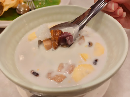Lastly is the bobochacha dessert. The yam and sweet potato are still hard and the sago are sticked together.