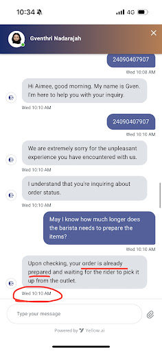 Does this mean that the CS was giving a false update on my order? 10:10am updated that my order was ready, but outlet said my drinks are not prepared at 10:25am. After asking the CS on this, they just ignored my question and copy & paste the same reply, which is super irresponsible.