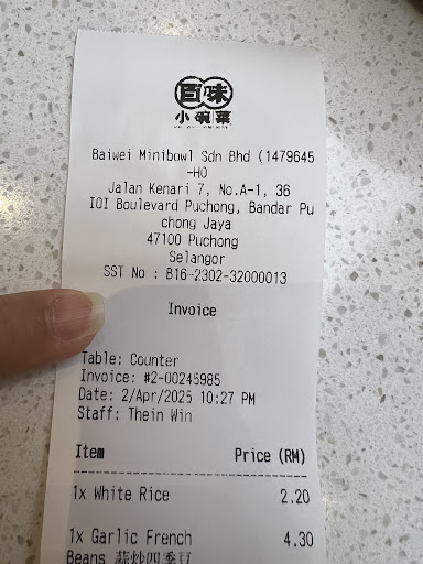 Bai Wei Mini Bowl, u should track the CCTV according the receipt timing. Timeline few minutes before the payment.