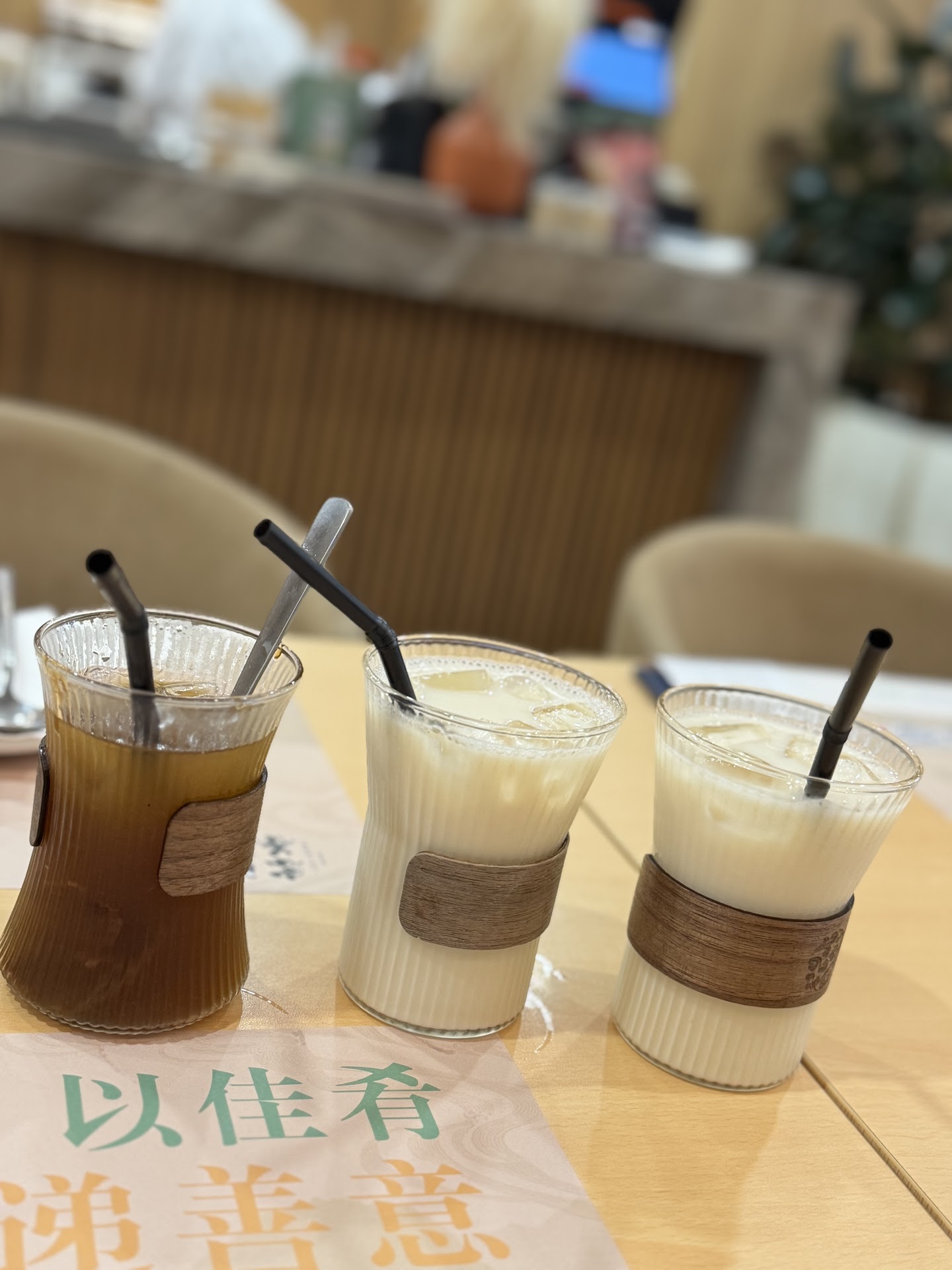 We also ordered a set meal featuring salted baked chicken with herbs, along with an Ă la carte serving of braised Hakka four treasures. To complete our meal, we had brown sugar ginger tea and soy milk. The brown sugar ginger tea paired perfectly with our dishesâI loved its strong ginger flavor, which made it extra comforting, especially on a rainy day. If my stomach had room, I wouldâve happily had a second glass!