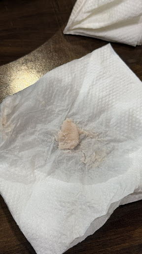 We didn’t take photos of the bowl, but we did capture the puked-out chicken on a tissue—you can clearly see its mushy texture and pink color.