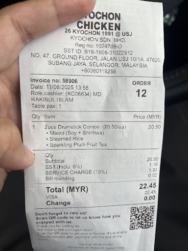 Read moreBeen here 3 times. All of that 3 visit, they didn’t have the fried rice. It is very weird cause other outlet i have been, there’s always few choices for rice. The worst part is i came once at 8PM, and they didn’t allow me to dine in. The reason is “lack of manpower”. Seriously ? When u have 4 staffs in the shop, and your only customer (at that time) is me sitting on the table and you said i can’t dine in ? Then I suggest you should just remark for USJ outlet “TAKE AWAY ONLY”. Worst outlet ever for Kyochon. I’d rather visit SS2 only which is far from me as long as I’m getting a good service. 0 stars for me if there is...