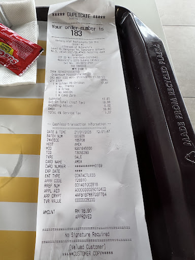 Read moreIt happened at Mcdi SS15 Subang Jaya. The staff forgot about my order despite I ordered through the terminal, even with a table number 117. Can you imagine such thing happened in a computerised system like Mcdi. After waited for 15 minutes, I went to ask for my order and a lady manager said to me that the computer system down. Then she asked for my receipt and given her my receipt. Waited for 10 minutes, then a male manager came out to ask me what is my order number and which terminal that I used to key in my order. Then he reprinted my receipt again. If he can reprint my order, I think the computer is NOT down. That means the receipt that I initially given to the lady manager is lost. What a stupid process and service. The service altitude of the lady manager (who service the table as she said ) is the worst that I ever encountered in all Mcdi outlets. And always give excuse each time I enquired.