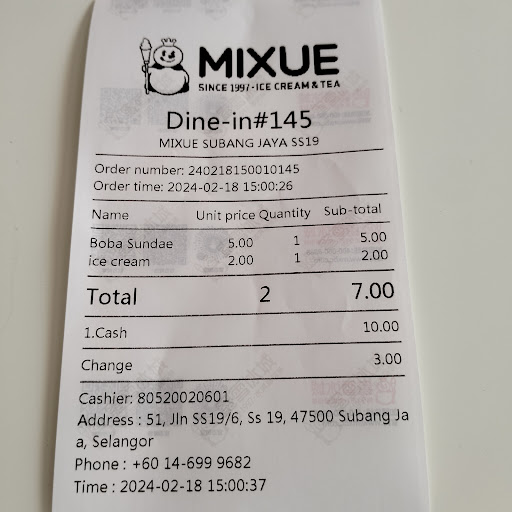 Read moreSS19 MIXUE, Subang Jaya is our regular outlet especially for Iced Lemond Tea. Occasionally we went for peach or mango flavoured. Popular among school children as well as adults. At times it can be busy but we don't have to wait long because the outlet is well staffed. The only bottle neck is at the counter when they have many online orders and coupled with those in line who are fickle minded on what to order. They stil dol have redemption cards for free ice cream as well as drinks. With the opening of the SS19 Food Court across the road, finding places to the park car is...