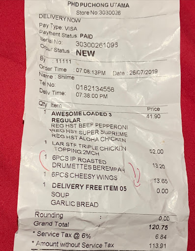 I checked the bill, I’ve been charged RM13.20 for the drummets and there’s an arrow showing it’s been replaced with soup & garlic bread.