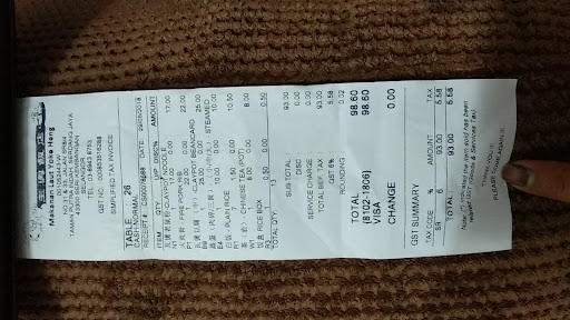 Read moreNO STAR shall be earned from me. Because this shop seems simply charge as they like. You might find this is small matter and worth not to mention. My experience: I have ordered the Chinese Tea pot Teh Kuan Yin with 4pax which make know since before start order. After finished dinner then comes the bill, they charge RM8, while I ask how they charge for tea, the staff asked which table was I from. (To me, it's the matter how you charges, should have regardless of which table or what you have been ordered.) While I can't wait and proceed to the young boss, the staff them quickly tell the boss table number and yet the boss as well quickly go to the cashier and take the bill and simply answer charge per head, I ask how much per head and he can't answer and looking at the order sheet said 4+2, we counted 5 and charged RM8, I said I ordered 4 which confirmed informed to the staff and as well I heard the staff told the person who make the tea to make for 4. He said then we count the cups, I said 4 cups and he replied "oh then I return you RM1 lo". Is this worth a star to rate? It's not the matter of how much money are there, if this is been cheated, 1cent is too much for me. I would say last time was not like that, their attitude towards this issue was unacceptable to me at all. Again, no star from me. If you go for any meal, please check carefully your bill, being cheated, 1cent...