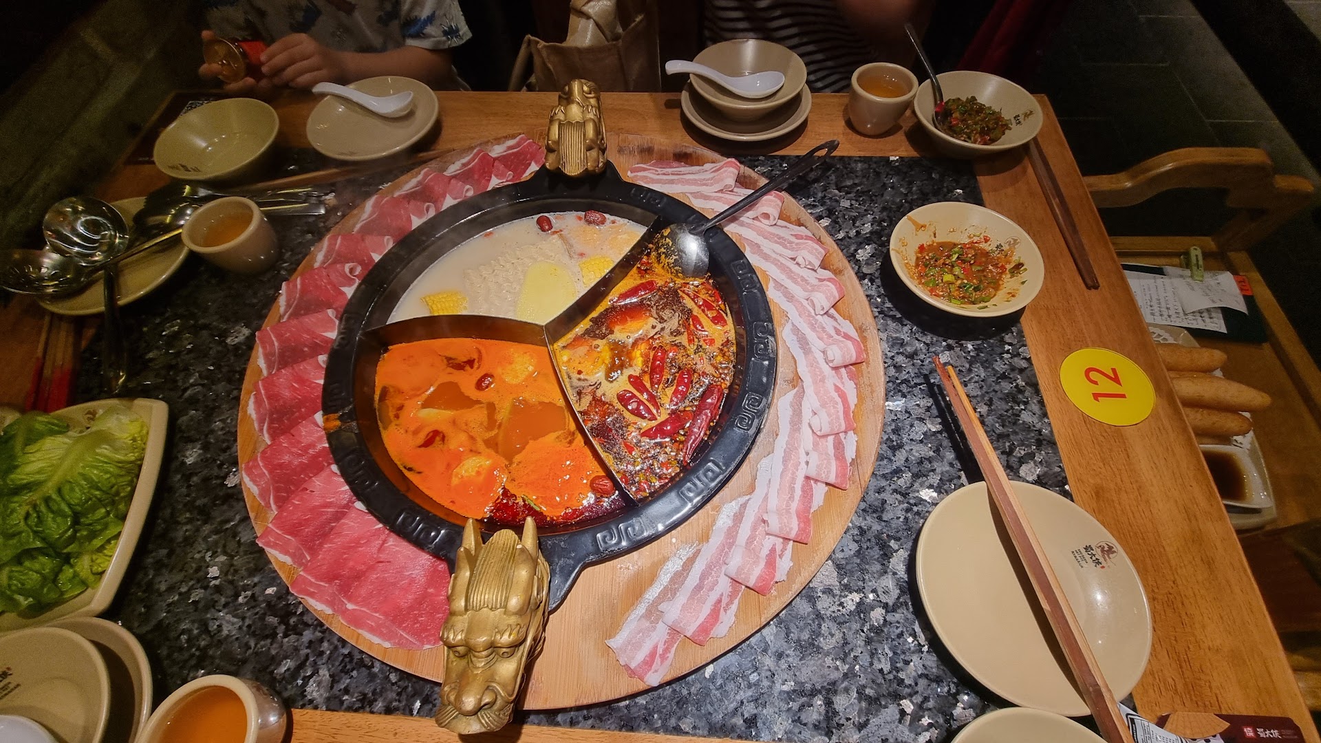 Read moreLonging to try out this highly rated mala hotpot. Be sure to call both branch to check table availability and bookings. Waiting time is expected if you dont make a booking, but you could always take a stroll in sunway pyramid while waiting, they will call you when its almost your turn. Soup base is top notch among many hotpot that ive tried, but the mala is a bit way too oily for consumption. I always take a few sips of other mala soup base at lamei hotpot, but the mala soup here is just way too oily. The pork bone soup base is also very aromatically sweet. The best part of my whole visit is the service level of the staffs. Very friendly, accommodating and willing to serve. I consider service at HDL somewhat excessive. Dishes and condiment are all great. Pork and lamb slices are also sliced to thin perfection. I felt lamei hotpot is slightly cheaper and provided a slightly better value overall, ive checked some of the prices of the side, lamei is consistently cheaper, and given that lamei do provide free beers per 100 spending n loads of voucher. Anyhow... shu daxia did provided a conciously better service n cleaner cozier dining...