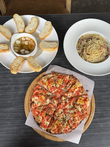 We tried several dishes and each one stood out. The German Pork Knuckle was excellent – the skin was perfectly crispy while the meat inside was tender and juicy, complemented well by the sauerkraut and dipping sauce. The Salmon Mentai Pizza came with a thin, crispy base and a rich topping of salmon and creamy mentai sauce – very flavorful without being too heavy. The Carbonara Pasta was creamy, rich, and satisfying, with the pasta cooked just right. My personal favorite was the Gambas Al Pil Pil – sizzling prawns served in garlic and chili-infused olive oil. The aroma was mouthwatering, and dipping the French bread into the sauce was simply addictive.