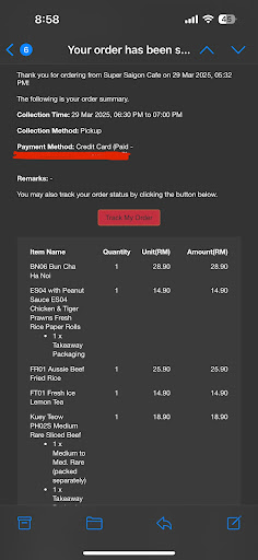 When I arrived at the restaurant at 7:00 pm, the place was understandably busy and full. To my shock, they had not processed or even received my order. I showed them the order and payment confirmation emails, but the staff struggled to log in to Oddle and couldn’t retrieve my order from their system.