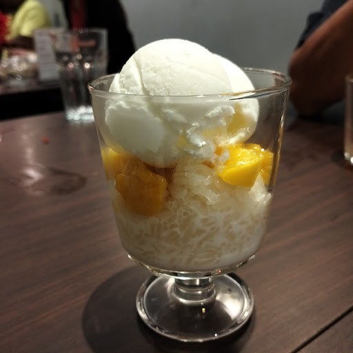 Greeted in Thai upon entering ❤️ Loved the Seafood tom yam soup. Tangy and spicy, very appetizing. Spring rolls served piping hot crispy with silver noodle filling. Som tam was crunchy, sour and fresh. Delicious mango, coconut and rice dessert, just nice...not too sweet. Rice was still very hot, ice cream served on top miraculously didn't melt ! Will definitely order again. RM15.90 for this dessert: big enough for 2 to share after a satisfying meal. Siakap with chilli was ok, around RM50? Green curry beef was alright, slices of beef were soft. Enjoyed the cold Thai tea, sufficient ice, slightly fragranced and not overly sweet. Huge bowl of Tom yam soup around RM55 ? Total bill...