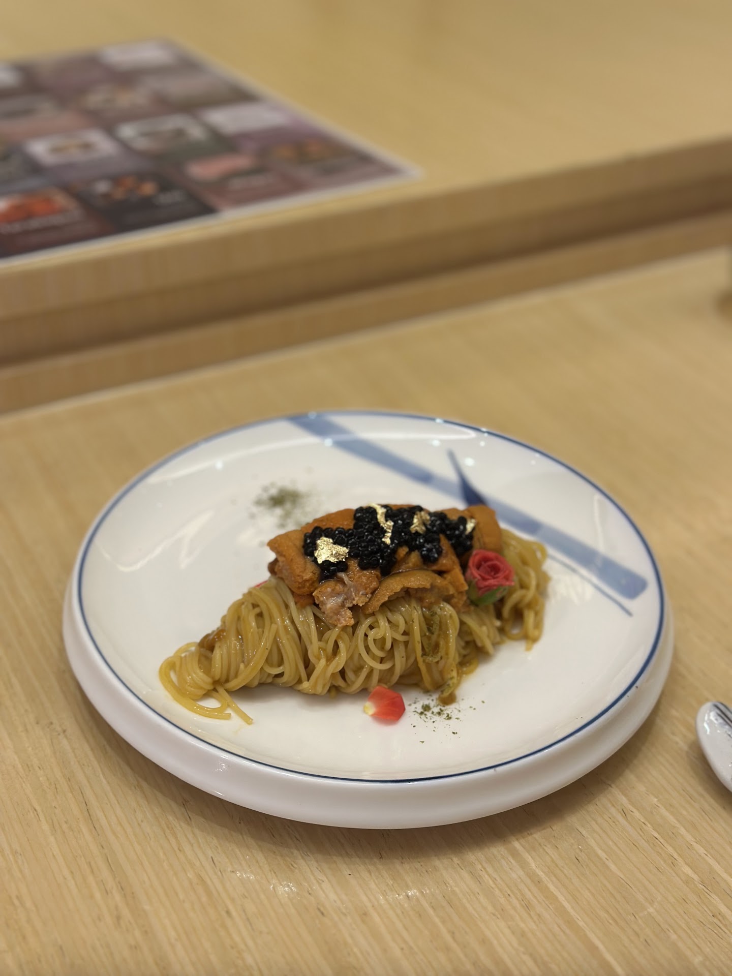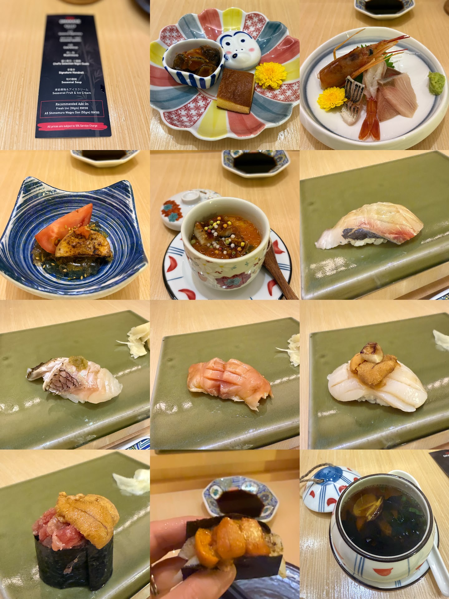 Fish are fresh, but combinations of fish and some condiments do not not match well, and not outstanding enough, example the first appetizer (chestnut with tomato and jelly) is too sour (though the chef has warned us about it), it is really very sour for the first appetizer, next is the cold dish, tastes like carrot cake texture, this combination does not match well, other fish nigiris and sashimi are fresh, thumbs for the fresh uni, but other combination not outstanding enough.