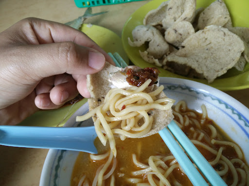 Nice shady road side curry fish noodle eating house in a friendly town. The usual customers have a close bond with the owners. It isn't strange to see them helping out while waiting for their own curry fish noodles.