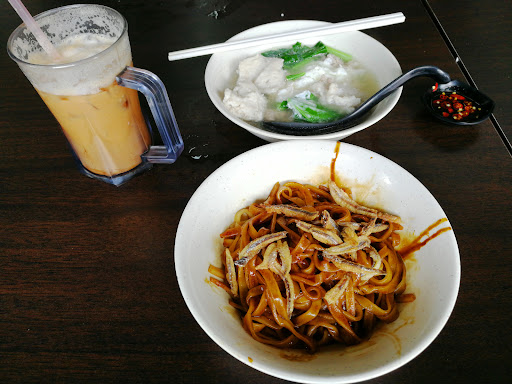 This eatery is renowned for its thick flat noodles (pan mee), crispy fried wonton (dumpling), and delicate fish paste (Yu Hua). The pan mee has a firm yet smooth texture, offering a satisfying bite. It is served in a rich, flavorful broth accompanied by bouncy fish balls and tender fish fillet, enhancing the overall taste experience.