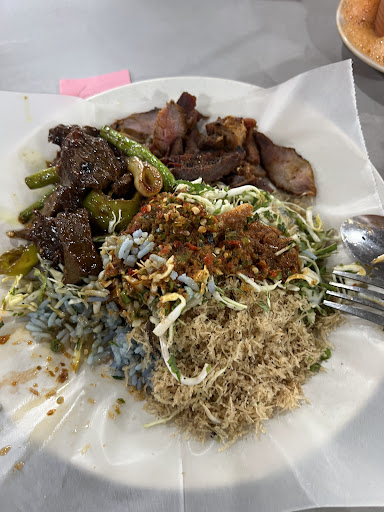 Modest warong ambiance, yet clean and spacious. Nasi Kerabu tastes good with grilled chicken or lamb. Adequate portion. They have only about 4 types of self-service drinks available. They should improve the payment process. To avoid wrong charging to the customer, they should direct the customer to pay straight at the counter at the end of the queue after receiving meals from staff. Currently, the staff will come to the table during dining to calculate the price. We bought 3 nasi kerabu and 1 nasi minyak kambing (4 meals in the photos), 1 pack of keropok, 2 teh o ais. The total cost should be RM39 based on the menu pricing. But we were charged RM45. Extra RM6, which I only realized later. Perhaps the waiter mistaken an empty plate we took earlier (and put a bit of excess portion from each 4 plates) as one full Nasi Kerabu meal. Nevertheless, this place has become viral, and customers queueing up.