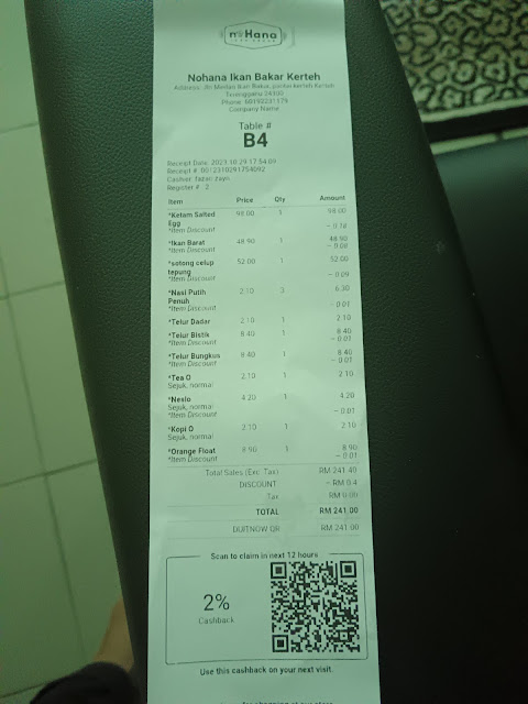 Rasanya cukup la pandangan saya atas masakan di Nohana Ikan bakar ni. Secara jujurnya, saya AMAT mencadangkan kepada sesiapa yang nak merasa makanan laut di Kerteh. Berbaloi sangat dengan harga. Oh yer, jumlah keseluruhan makanan (Ketam, Ikan Pari, Tomyam, Kangkung Belacan, Milo Ais, Teh Ais, Sirap Limau dan Sirap) ialah RM93.00 tapi dapat diskaun RM3.00 jadi jumlah yang dibayar ialah RM90.00. Berbaloi...