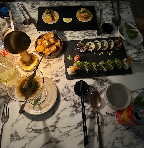 Tantalizing spread of sushi rolls, crispy tacos, and golden-brown appetizers, presented on sleek black plates. The intimate atmosphere is enhanced by warm lighting, inviting a relaxed and upscale dining experience. The open-air dining setup by an illuminated pool, creating a tranquil and romantic ambiance, perfect for a...
