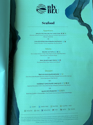 My colleague and I had a truly memorable experience at Only BLU, the largest under-ocean restaurant in the Maldives. Located 6.8 meters below sea level, the restaurant offers a beautiful view of marine life and a romantic dining setup for couples. Upon arrival, we were greeted with a welcome glass of sparkling wine and canapes. What impressed us the most was the extensive menu selection, with five different menus to choose from. Whether you prefer seafood, fish, meat, poultry, or vegetarian dishes, there is something for everyone. Each menu is paired with red and white wines to enhance the dining experience. The service was discreet and the appetizers, mains, and desserts were elegantly presented in wooden stands. The portion sizes were generous and the quality of the ingredients was top-notch. The staff were incredibly hospitable and attentive, making our dining experience even more enjoyable. We highly recommend Only BLU for anyone looking to experience fine underwater dining.