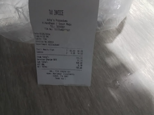 Food was ok, but all items except rice and fish were stone cold. I was promised fish curry for my thali, but they forgot to make it. I received a vegetarian thali instead. I asked where my fish curry was and they said fish had run out? Anyways, they eventually brought me some fried fish? Don't know what happened to the spicy fish curry I was promised? Food tasted OK, but for sure would of been better hot. Portions are small. The little pots had half of London servings. Plain rice is old, wet and reheated rice. Really cheap and bad quality. Please check your bill. The menu and bill does not tally at all. When questioning prices some excuse will come up. The price on menu for thali is one price only. Apparently fish or meat is charged differently. So, why is this not on the menu? Kind of fed up, as it happens too often in the Maldives. Never happened to me on resorts, just Male and local islands. Also truly unfair to charge service charge for two takeaway samosas, which I ordered after meal to go. They added my takeaway to the bill, (not separate), and charged service on the takeaway items. The samosas looked lovely. I just tried them now. They are awful. I binned them. Horrible tasting, and no flavour, no chilli or spices. The ones I had on Thoddoo...