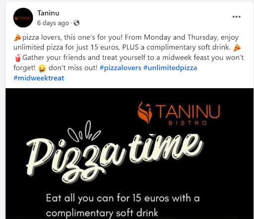 We got the fried cheeselets as one of the starters, it was super salty and no honey/jam came with it as stated on the menu, with no warning or anything.. when it arrived and we asked for it they said it was not available on the day. The tagliata was written as it coming with rucola, tomatoes and hard cheese, but instead it came on a sizzling plate which continous to cook the meat on a bed of grilled veg and roast potatoes (luckily no one was allergic), not as was written on the menu. The sauces that came with the meat just tasted like packaged Knorr full of sodium, not like genuine chef made sauces. The pizzas were severly undercooked and the owner/manager noticed this, and without asking or saying anything he took the plate from under one friends mouth to take the pizza and cook it more, with not much effect to the pizza tbh. The pasta just tasted of garlic. The owner/manager was fake friendly and quite annoying tbh.