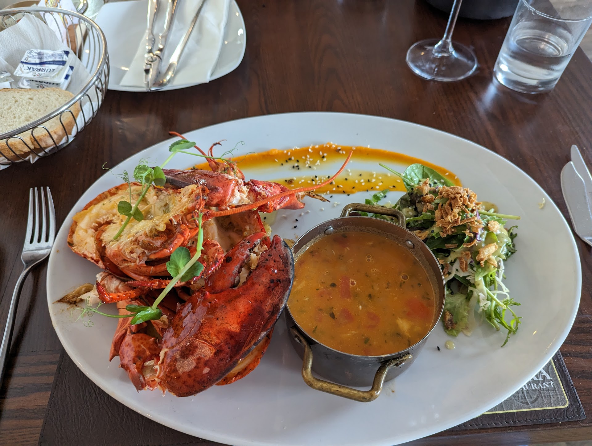 Lobster picked (and the wife now happy with a risotto) we picked out a white Maltese wine (Chardonnay) that was just fantastic, that alongside the fresh complementary bread and cold still water the evening was off to a fantastic start.