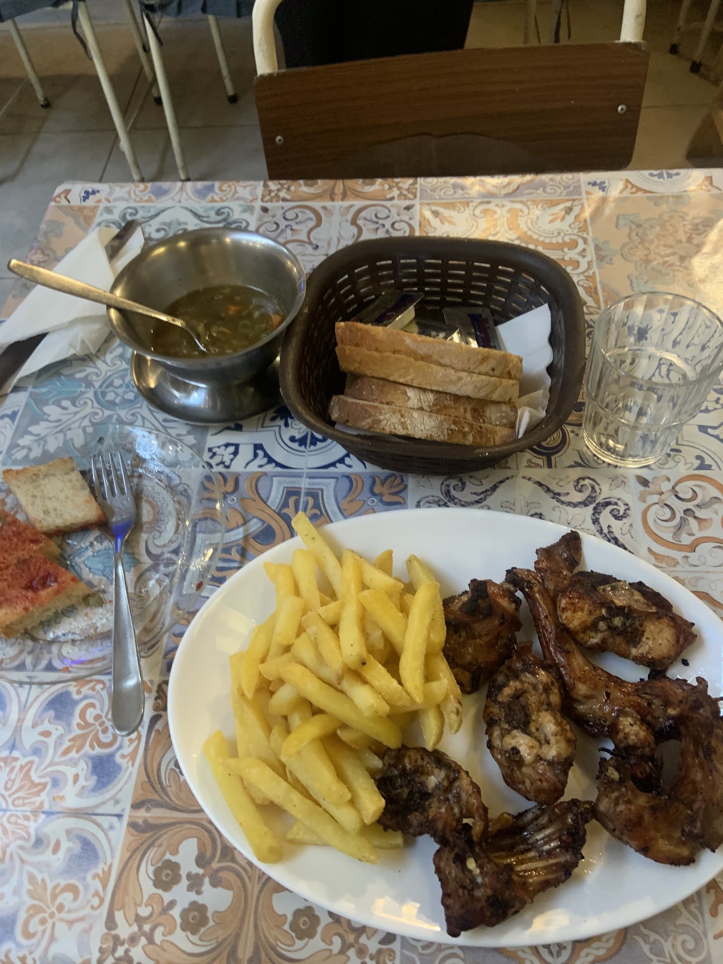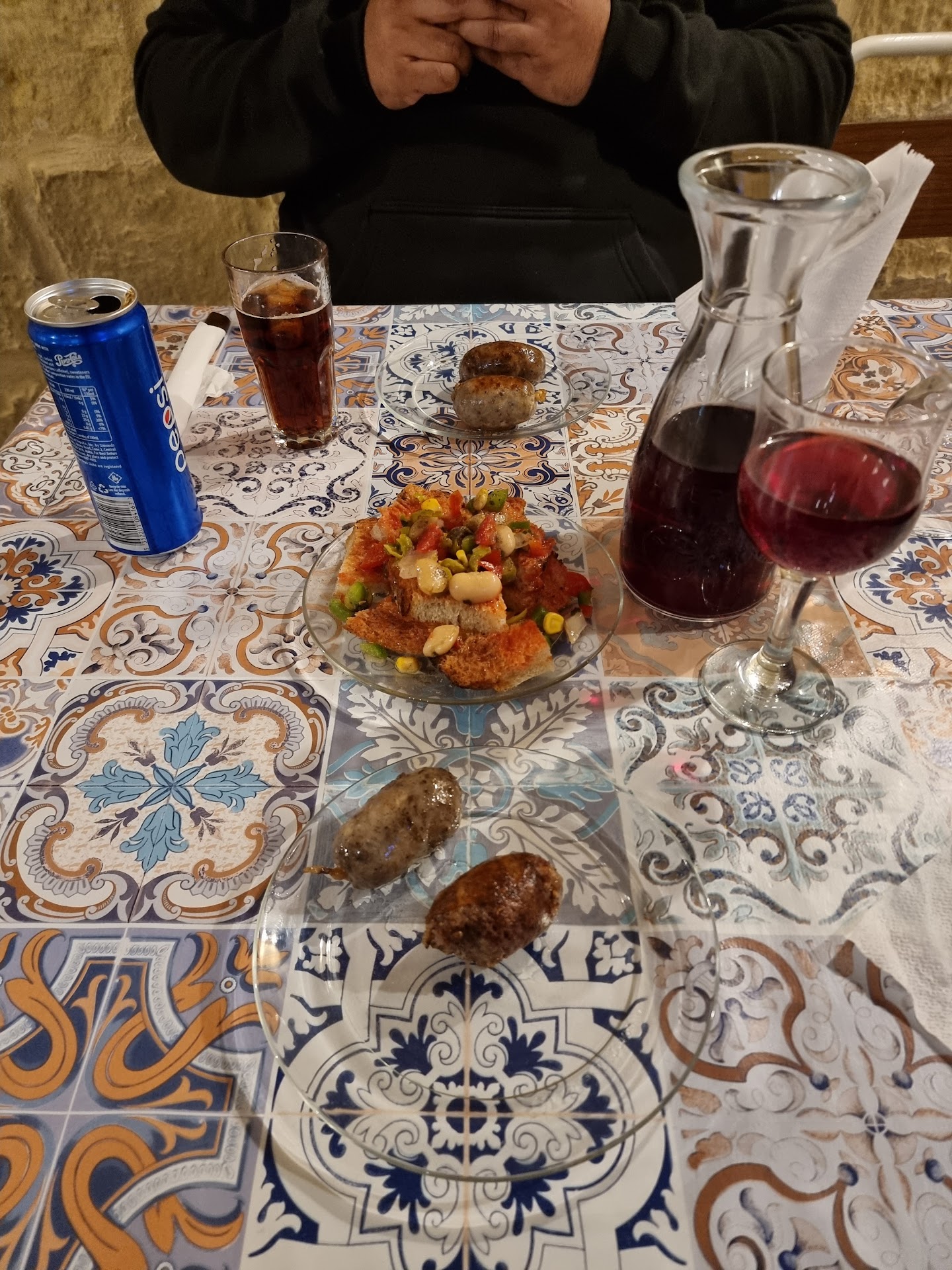 We had the 3 course menu plus I had the farmers wine. I asked to substitute the goat cheese for another sausage for starters. The bruchetta lookalike was tasty. However the wine tasted like ribena, I wouldnt recommend it. 2nd course, the spaghetti and sauce was delicious! The rabbit had many bones and we both found it dry but the sauce was flavoursome. I didn't get liver in my meal but my partner did but he didn't try it. The desert was incredibly sweet, similar to halva.