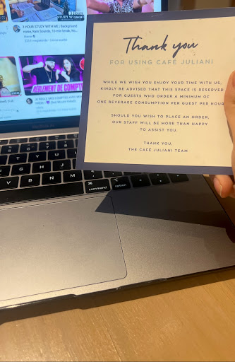 Read more😡I go to this place every day and study there for hours , I always advise my colleagues to go there for meetings and studies… . Today the worker there came to me and said in a mocking way Do you come here to do your homework or what? With all respect, I told him that I was studying for my exams after few minutes he came back with this paper and he told me that I cannot stay here as long as I do not ask for something every hour so every hour I should order something 😃 You must have a business mind Since I come to this coffee shop every day, this means that I am an effective producer In addition to this, I advise my friends and colleagues to meet there so 😡I am advertiser , There are convenient facilities for the regular consumer There are also conditions that do not apply to them. You must learn the art of dealing , will never fly 🤭 ahh , I forgot something when When I was leaving he told me I will pay for your hot chocolate It's as if he's saying we don't need your money. How rude of you , I am student...