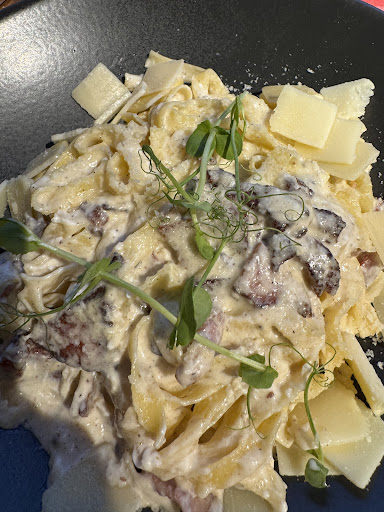 I recently had the pleasure of dining at this restaurant, and I must say it was a truly delightful experience. The food was not only incredibly tasty but also beautifully presented — a real feast for both the eyes and the palate. I had two dishes, one pasta in a rich and creamy sauce with perfectly cooked bacon and parmesan flakes, and a second plate featuring rolled chicken with mashed potatoes, grilled asparagus, and a touch of pesto. Both were bursting with flavor and clearly prepared with great care and attention to detail.