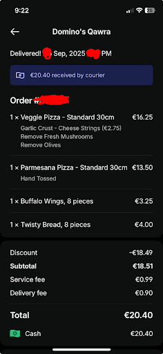 The food was brought back to the hotel and the pizzas weren’t even cooked properly with gooey crusts in the middle. The wedges were also cold and they didn’t even give us the right dips that we ordered too.