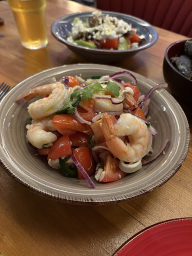 Food The food was absolutely delicious. The Greek salad was vibrant and fresh, with crisp cucumbers, juicy tomatoes, black olives, and crumbled feta cheese, all drizzled with olive oil and herbs. The mussels were perfectly cooked, rich in flavor, and complemented by a savory broth with cherry tomatoes and a touch of garlic. The shrimp dish was refreshing, with a perfect balance of acidity and spice from red onions, tomatoes, and fresh herbs. The sea bass was the highlightâtender, flavorful, and cooked to perfection.