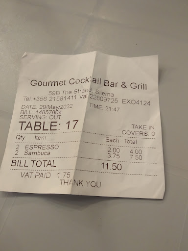Read moreI went with my fiancee and we ordered 2 espressi corretti at the counter: the request was perfectly normal, at least that's what you expect out of a "gourmet bar" (fyi price is normally 2/3€). The bartender served two small sips of sambuca inside my 2 espresso directly fron the bottle, which was actually what I wanted and how it's made. Surprise!! The receipt received from the cashier shows 2 espresso and 2 sambuca (as far as I know when you order sambuca it's meant to be dosed in a glass!), which we never received. Total was 11,50€ Other than feeling a bit robbed of my money it's clear that someone in that bar is not very honest and competent at their job. The poor quality of the front personnel is also reflected in their behaviour towards customers, which I found unacceptable: one lady waitress asked me to "move away" since me and my fiancee wereI trying to enjoy our espresso at the counter (takes 2 minutes). I don't know about the food and rest of stuff but this is enough to tell you what a waste is this place. It's full of much better places that deserve your...