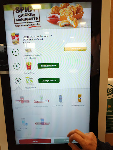Read moreI like Macdonald's. Not often, but, you know! Our visit there was good. Macdonald's has changed a lot over the years for the better. I'm fairly sure Ronald has been retired, put on gardening leave or has been locked up for crimes against sanity. A few comments. 1) The enormous touch screens are not great. When you give up and decide queuing in the rain (without a car) in the drive through bit is preferable something is very wrong. I like to ask "May I have, please" instead of "Can I get" because a little politeness and old fashioned non-American vernacular makes you sound a bit classy instead of a cretin. 2) The chef decided to sneakily put two Vege goujons in the 'sandwich' instead of a Vege deluxe patty. What's that about? Should you not tell your customers they aren't getting what they ordered? However...on the plus side, the table ordering is cool and the staff friendly. I wanted to play on the Samsung tablets because secretly I am 9 years old. It's quite difficult to access as a pedestrian - did the council stop you building a few steps Macdonald's? Weird. Keep it up guys. Shame about the recycling disaster... Paper straws you can't recycle? - That's an epic fail... in the modern vernacular of the cretin. Honestly, I like you (the people who work there and try so hard) but Macdonald's is not exactly getting the environmental stuff even...