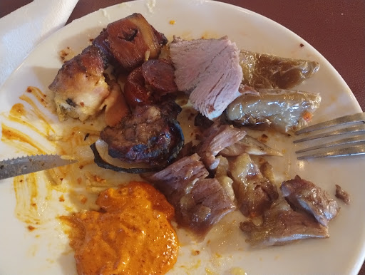 El hostess con muy mala actitud sin darnos bienvenida nos contó a cada uno y nos hizo pasar a la mesa, pero con mala actitud. La barra de ensaladas/postres está bien, pero le falta atención. Faltaban platos y cubiertos y el restaurante estaba prácticamente vacío. La barra de tacos. Sólo tenían tacos de chorizo. La barra de mariscos, las salsas las preparan con fanta y catsup (Incomible). La pasta fría de la barra estaba literalmente congelada, como si fuera de un día anterior. En general sirven chorizo en 3 variaciones, pavo con tocino, pollo de otras 2 o 3 preparaciones, picaña de cerdo (estaba buena), costillas de res al chipotle y BBQ (mala) y una laminita de picaña. En una mesa de 11 comensales, pasaron los primeros 10 minutos a ofrecernos de todo cada 2 o 3 minutos, a partir de ahí, la espera con los platos vacíos era entre 5 y 10 minutos a pesar de que les pedíamos a la mesera y los muchachos de las espadas. !Simplemente nos ignoraban! Ya molestos, le hablamos al gerente que inmediatamente resolvió el problema, cada minuto vinieron a ofrecernos otra vez los mismos "cortes" de lo que ya habían traído y al final piña asada con canela. El gerente no volvió a la mesa. La atención de la mesera fue buena, estuvo pendiente de nosotros en todo momento con lo que le correspondía.