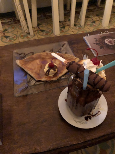 El servicio fue bueno, la chica muy amable, todo trajeron en tiempo. Las bebidas muy ricas y originales. La crepa está rica pero un poco cara para lo que es.