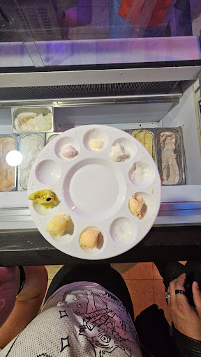 Tiene esas "paletas" donde te va poniendo un poco de cada sabor para que lo pruebes mientras te explica en qué consiste cada uno. Y ya servido lo decora con toppings de acuerdo al sabor del gelato.